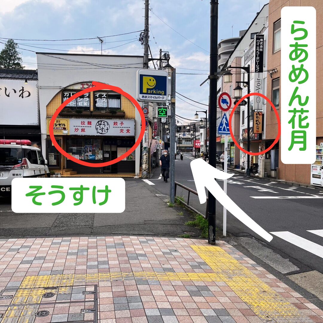 階段を降りたら左に向かい、「そうすけ」と「らあめん花月」のある道を直進してください。