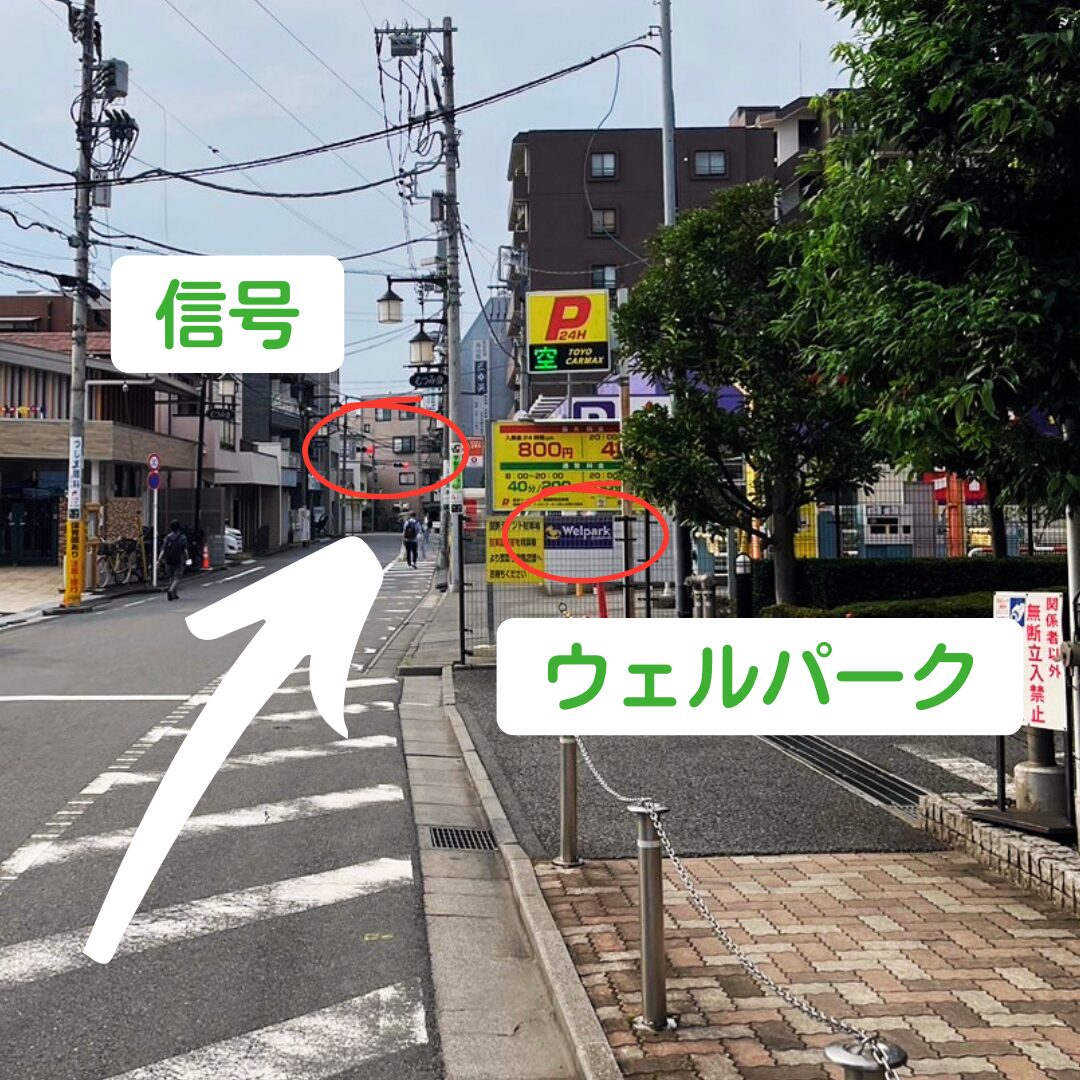 経路2の道を直進すると途中分岐があるので「ウェルパーク」の方に進み、信号のある交差点まで直進します。